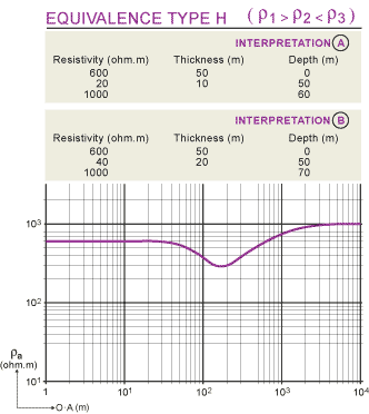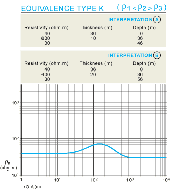 After having determined which type of curve corresponds to our sounding we will interpret this sounding to determine the resistivity and the thickness of the three layers. In the case of horizontal, laterally infinite layers, one unfortunately shows that to a given succession of resistivity and thickness corresponds only one diagram of electrical sounding well defined, the reverse is not true. An electrical curve of sounding can correspond to distributions very different of the resistivity and thickness, which can lead to an indetermination. There is plurivocity of interpretation. This indetermination appears in two particular forms, which received the name of principle of equivalence and principle of suppression Principle of equivalence The principle of equivalence concerns such a bed for which the resistivity is either greater than, or less than, both for the beds above and below the bed itself. Electrical soundings type K and H.